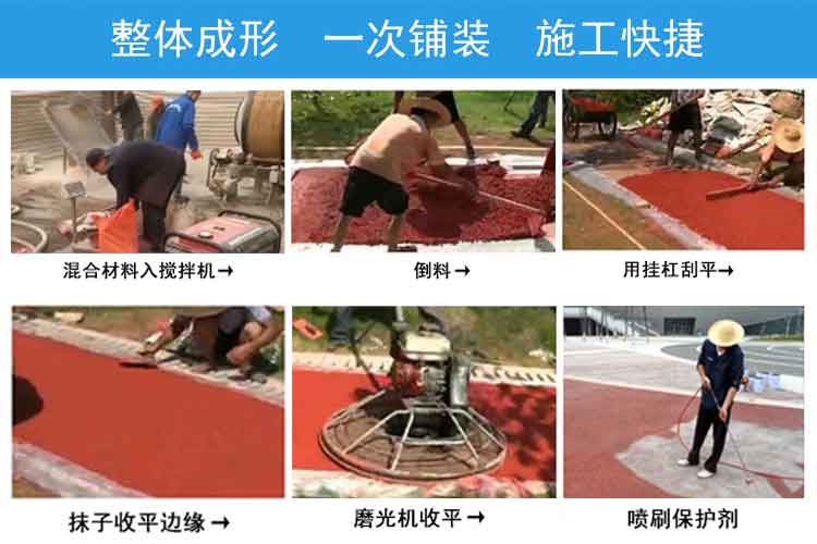 2.澆筑:透水地坪在澆筑之前,路基必須先用水濕潤。否則透水地坪快速失水份會減弱骨料間的粘結(jié)強度。由于透水地坪拌合物比較干硬,將拌和好的透水地坪和好的透水地坪材料鋪在路基上鋪平即可。